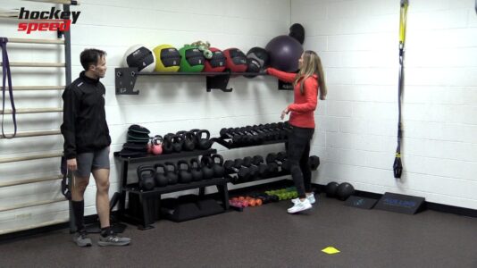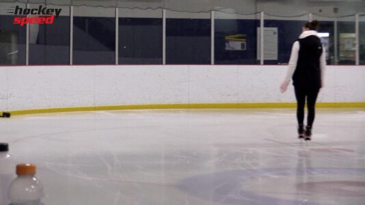 Katrina focuses on extending the strides. Starting with an underspeed lunge drill, she has the skaters use the full inside edge to push off. Heads up, jersey logo...