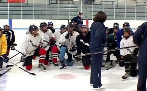 Amy starts off by saying that crossovers need to be taught from day one. Tilting into a crossover is key. First, she has her skaters lay their hockey stick on the ice...